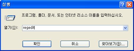 [시작]-[실행]을 누른 후 입력창에 "regedit"라고 입력하고 확인을 누르면